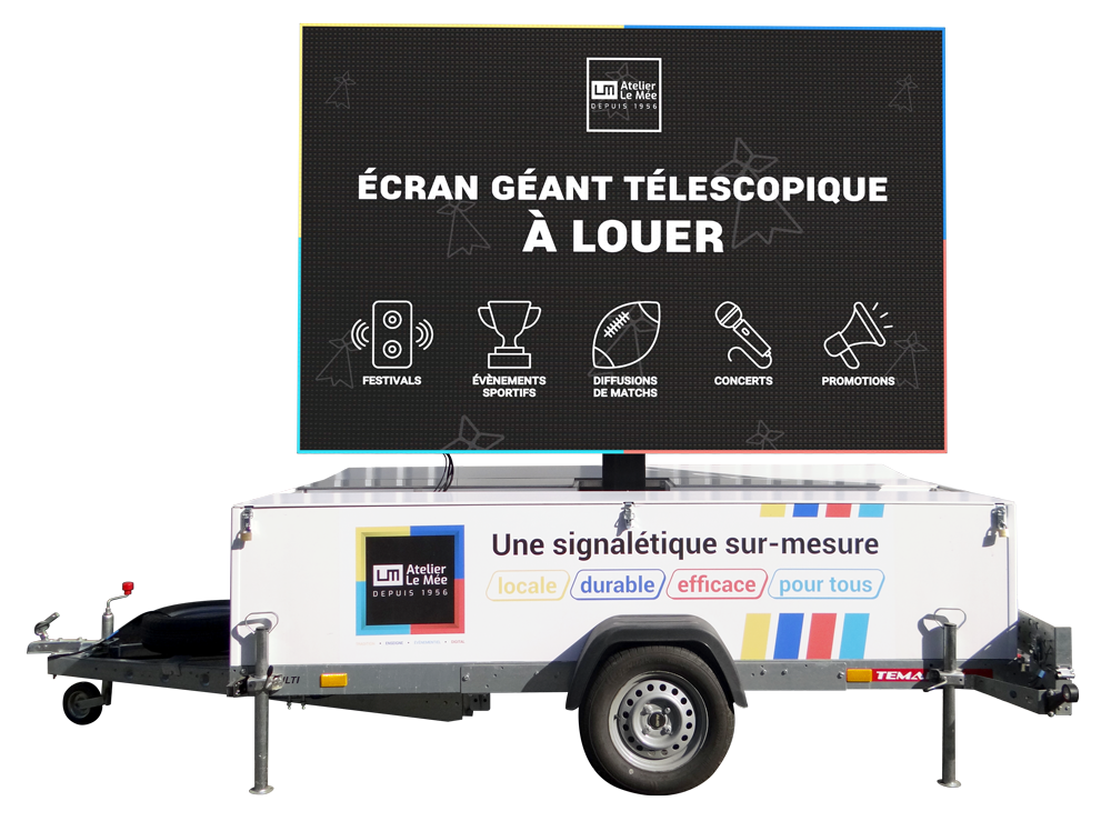 Découvrez l’écran géant LED sur remorque : Un écran très grand surélevé et mobile grâce à sa remorque qui vous permettra de diffuser n’importe quel contenu à taille XXL en haute définition, de quoi attirer les regards des passants. Programmez vos vidéos et visuels en toute simplicité grâce à son player intégré.