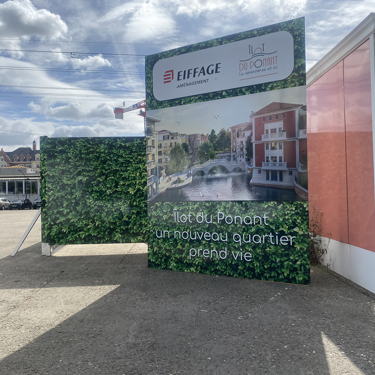 En attendant son arrivée, notre équipe de pose a été réquisitionnée pour installer des palissades sur le terrain, sur lesquelles on peut se projeter à travers les différents visuels du futur quartier !