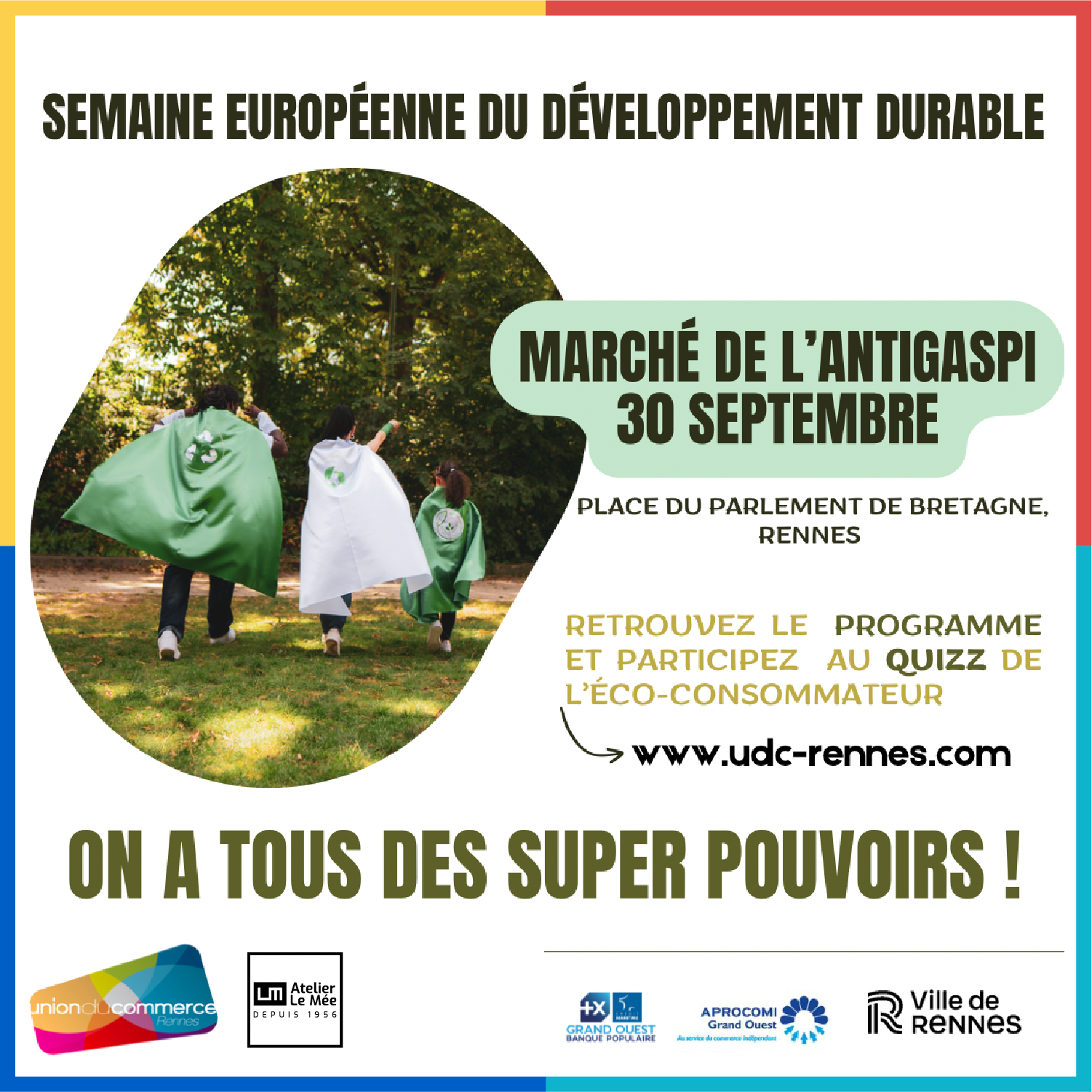 Dans le cadre de la Semaine Européenne du Développement Durable et de la Journée internationale de sensibilisation aux pertes et gaspillages de nourriture, l’Union du Commerce du Pays de Rennes avec le soutien de la Ville de Rennes, met en place des animations dans les commerces du Pays de Rennes du 16 au 30 septembre 2023 et organise le premier Marché de l’Antigaspi le samedi 30 septembre Place du Parlement de Bretagne à Rennes.